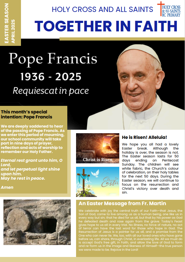 Together in Faith is our termly newsletter celebrating the ways our school community grows in faith, prayer, service, and learning. Each edition highlights how our pupils, staff, and families live out our Mission Statement—“Love Jesus, Love Learning, Love Life”—through acts of charity, leadership, and Catholic Social Teaching. In the newsletters, you will find updates on our pupil ministries, including the GIFT CARITAS Ambassadors, Laudato Si Team, Reading Ministry, and more, as they lead prayer, support others, and put faith into action. We also showcase our work in charitable initiatives, fundraising, and environmental stewardship, along with ways the children demonstrate the principles of Catholic Social Teaching in everyday school life. Here, you can explore all past editions of Together in Faith, keeping up to date with the many ways our school celebrates, prays, and works together to live out our faith.