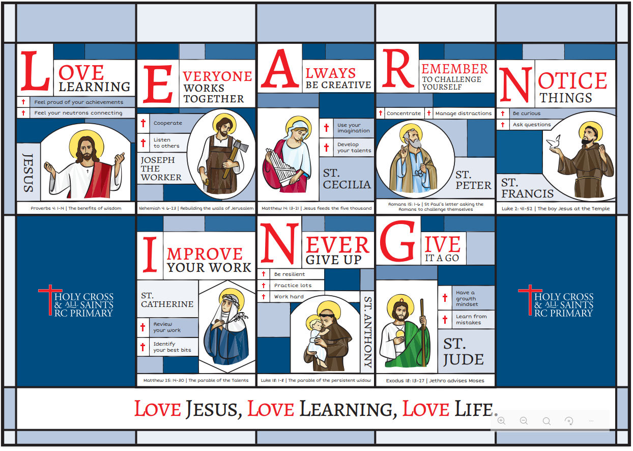 At Holy Cross and All Saints, we take our name very seriously and ensure that learning about the saints is woven throughout the year. We celebrate special feast days, explore the lives of inspiring saints, and reflect on how their example helps us to live out our faith today. Each department in school is assigned two saints, and together these eight saints form the foundation of our Learning Powers. Every saint is linked to a piece of scripture that guides and inspires the children, and classes mark their saints’ feast days with prayer, activities, and celebration. Through this, pupils come to understand that the saints are real role models who help us grow in faith, character, and learning.